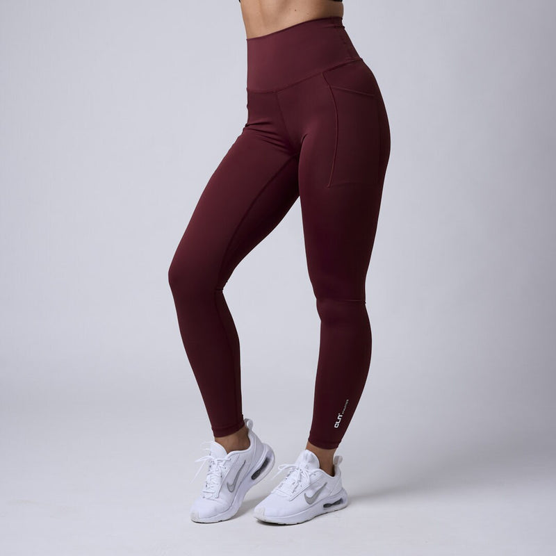 Mörkröda träningstights med fickor Tight passform Hög midja 70% Återvunnen polyamid, 30% Elastan Maskintvätt Modellen har storlek S och är 170cm lång