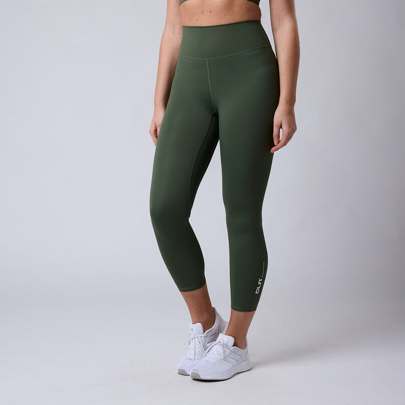 Gröna träningstights dam Tight passform Hög midja 7/8 tights har 6cm kortare innerbenslängd än full längd 70% Återvunnen polyamid, 30% Elastan Maskintvätt Modellen har storlek S och är 175cm lång
