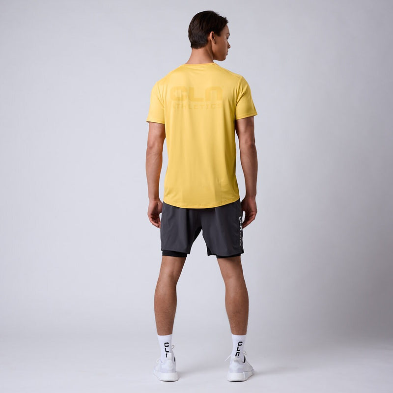 Gul tränings t-shirt i funktions material Passar högintensiv träning Hög fukttransportförmåga Normal passform 90% Återvunnen polyester, 10% Elastan Maskintvätt Modellen har storlek L, är 188 cm och väger 80kg