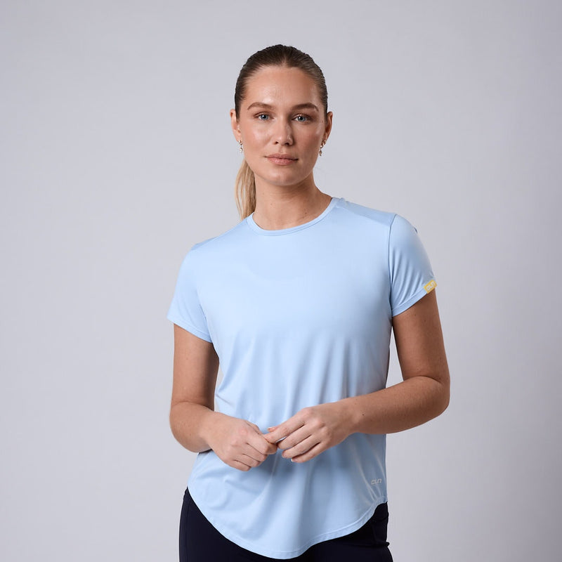 Ljusblå tränings t-shirt dam CLN Athletics mest sålda t-shirt Ledig passform 88% Återvunnen polyester, 12% Elastan Maskintvätt Modellen har storlek S och är 175cm lång