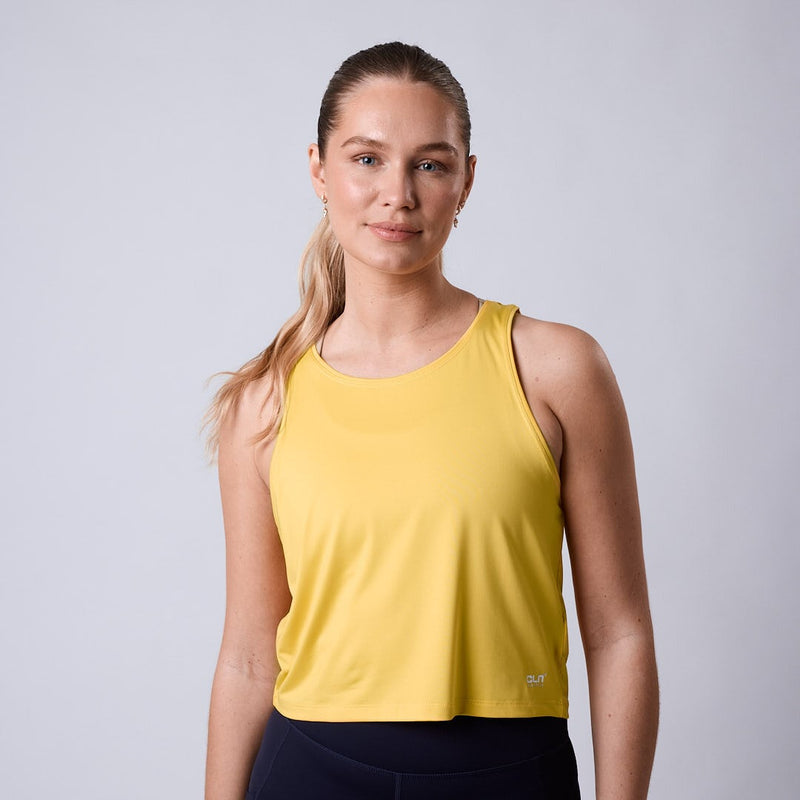 Kort träningslinne för dam Gult croppat träningslinne Normal passform 90% Återvunnen polyester, 10% Elastan Maskintvätt Modellen har storlek S och är 175cm lång