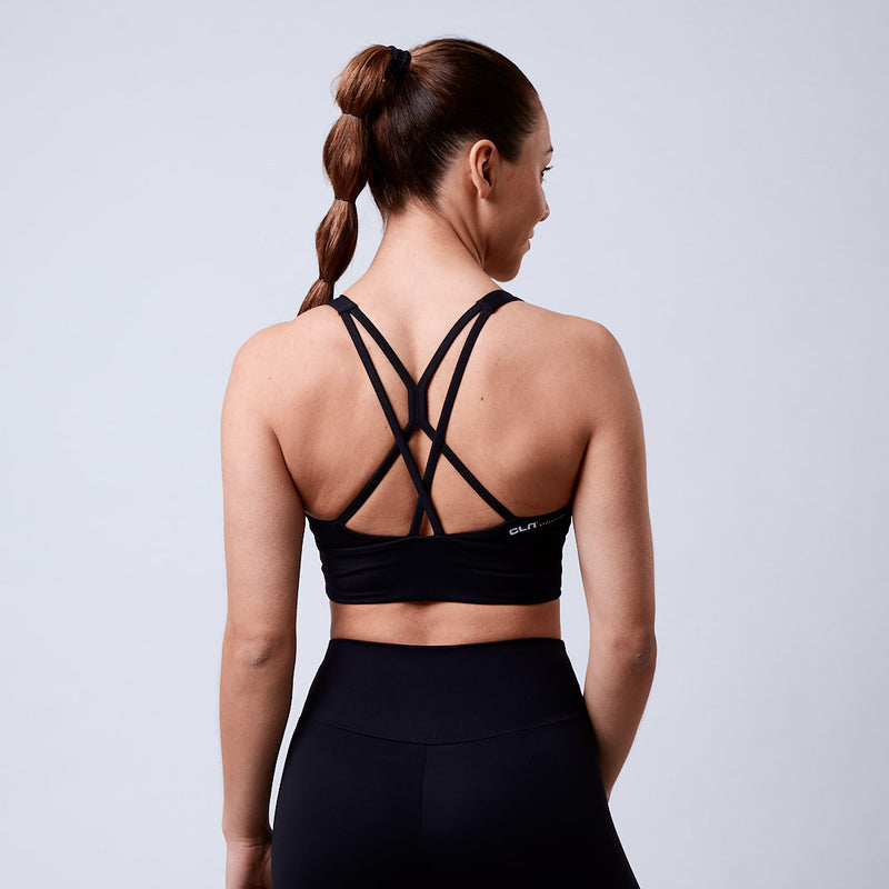 Svart Sport-bh med medel support Tight passform 70% Återvunnen polyamid, 30% Elastan Maskintvätt Modellen har storlek S och är 162cm lång.