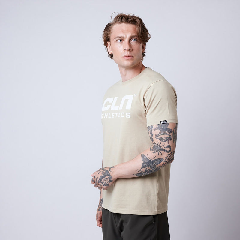 Beige tränings t-shirt herr T-shirt för gym, styrketräning & crossfit Stort 3D-print på bröst Modern passform 60% bomull/40% polyester Maskintvätt Modellen har storlek L, är 186 cm och väger 88kg