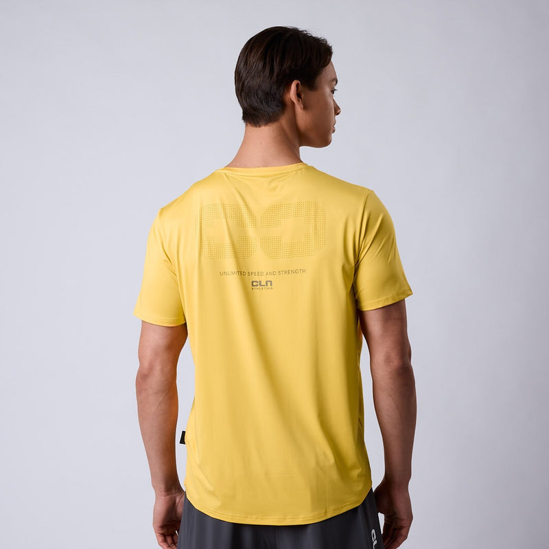 Gul tränings t-shirt i funktions material Passar högintensiv träning Imponerande fukttransporterande egenskaper Normal passform 88% Polyester, 12% Elastan Maskintvätt Modellen har storlek L, är 188cm och väger 80kg