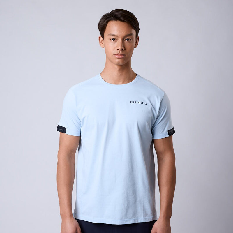 Produktdetaljer Ljusblå tränings t-shirt för herr Normal passform 60% bomull/40% polyester Maskintvätt Modellen har storlek L, är 188 cm och väger 80kg